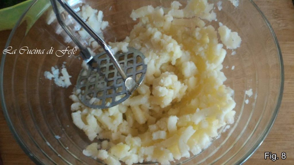 Em uma tigela grande, amasse as batatas já cozidas com a ajuda de um espremedor de batatas (fig. 8).