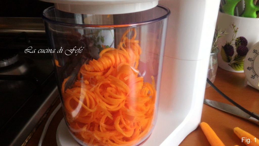 Lave, corte e descasque as cenouras. Usando um espiralizador, faça espaguetes de cenoura. Alternativamente, você pode ralá-las (fig. 1).
