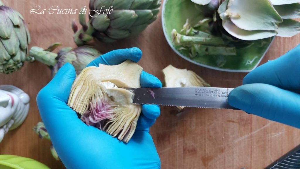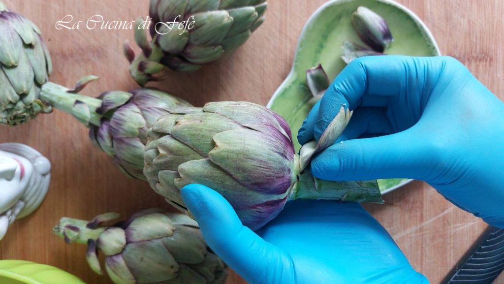 Para preparar as alcachofras gratinadas no forno, comece pela limpeza das alcachofras. Recomendo o uso de luvas para evitar manchas nas mãos e preparar, com antecedência, numa tigela grande, água acidulada com o suco de um limão para que as alcachofras não escureçam. Remova as folhas externas mais duras, girando as alcachofras entre as mãos.