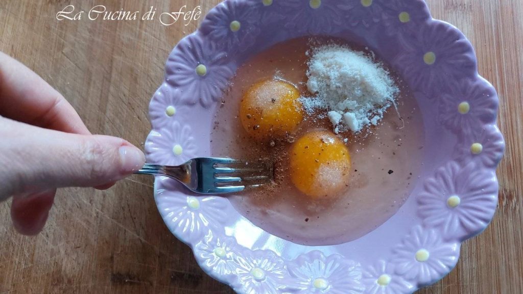 Enquanto isso, numa tigela bata os ovos com um garfo, acrescentando uma pitada de sal, uma moagem de pimenta, a noz-moscada e o parmesão ralado.