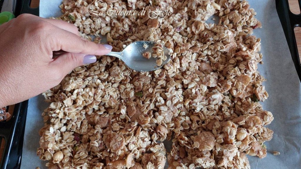 🟣A escolha de adoçar apenas com açúcares da fruta, bem mais saudável e atenta também para aqueles que desejam seguir uma dieta controlada, tem uma única contraindicação final: pode parecer pouco doce na primeira prova, especialmente para paladares acostumados aos sabores industriais ricos em açúcares refinados. Meu primeiro conselho, então, é reeducar o paladar, acostumando-o gradualmente a sabores menos doces. À medida que saborear esta granola, verá que não notará mais a sensação inicial de desagradável falta de açúcar e aumentará em vez disso a sensibilidade à doçura natural dos ingredientes, a favor da saúde! Mas se você realmente não conseguir, a alternativa é adicionar 1-2 colheres de sopa no máximo de mel à mistura antes de assá-la ou adicionar 40 g de chocolate branco picado junto com o amargo uma vez que a granola esteja cozida. Além do mel, outros adoçantes que podem ser usados são xarope de agave, de bordo ou malte de cevada e de arroz.