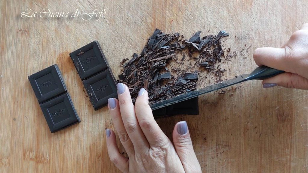 Depois desligue e deixe esfriar lentamente no forno com a porta semi-aberta por alguns minutos. Enquanto isso, ocupe-se de picar grosseiramente com a faca o chocolate amargo.