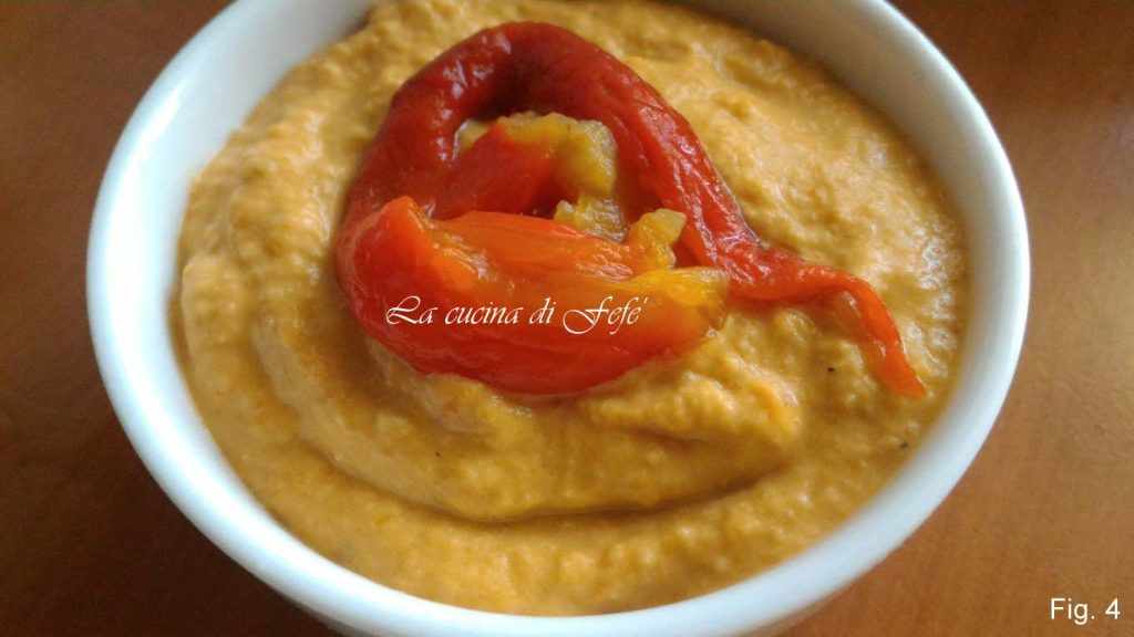 Processe tudo várias vezes até obter um creme denso e compacto. Transfira para uma tigela e finalize a apresentação com uma fatia fina de pimentão e um fio de azeite pouco antes de servir.