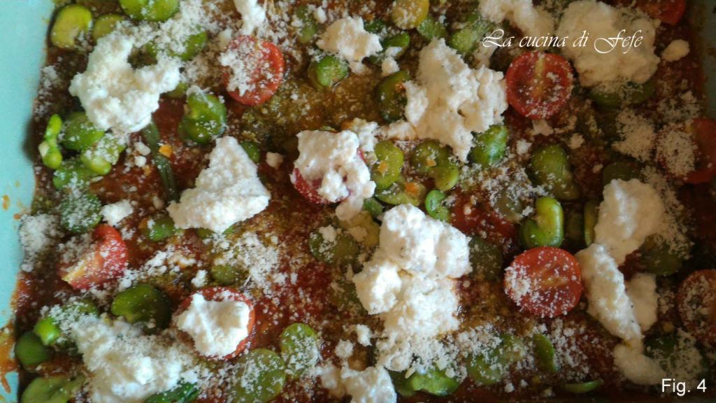 Cubra as lasanhas com mais algumas colheres de molho e pesto. Adicione os tomatinhos cereja cortados ao meio e as favas frescas depois de as ter previamente escaldadas por 5′ no caldo de legumes fervente.