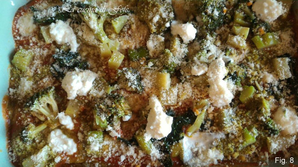 Finalmente, crie uma terceira camada de lasanha, tempere com o restante molho de tomate e pesto, então adicione as pontas de brócolis previamente escaldadas no caldo de legumes por 8′.