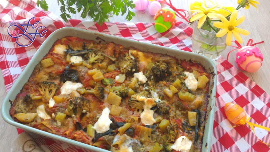Este ano a Páscoa foi para todos em nome da sobriedade! Sem grandes almoços familiares, nenhuma celebração em grande estilo e com poucos e simples pratos. Na intimidade de nossas casas, passamos esta festa tentando não pensar no que está acontecendo na Itália e já em todas as partes do mundo! Pessoalmente, escolhi ainda assim presentear a mim e meu marido um momento de leveza, arrumando a mesa elegantemente, adicionando um pequeno ramalhete de flores colhido dos vasos da nossa varanda e cozinhando esta fantástica lasanha. A escolha, como sempre, recaiu em um prato vegetariano único, rico em sabores, graças aos vegetais que o enriquecem camada após camada. Além disso, embora as lasanhas por antonomásia sejam frequentemente temperadas com bechamel, eu preferi optar por um molho de tomate cereja, um excelente pesto caseiro e toques de ricota aqui e ali, que, vou te dizer, não te deixará desapontado! Esta lasanha será perfeita para todas as ocasiões e você poderá enriquecê-la a cada vez com os vegetais da estação que tiver à disposição, exatamente como eu fiz!