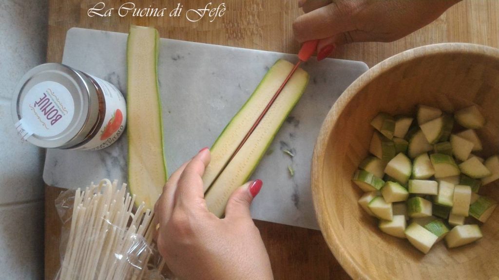 As linguines ao tomate seco picado são o emblema da gastronomia siciliana! Um prato principal simples, mas ao mesmo tempo sofisticado, capaz de combinar a genuinidade das matérias-primas com a elegância das combinações! Quando fui contatada pela Empresa Bonuè para testar alguns de seus fantásticos produtos, fiquei imediatamente entusiasmada, porque sabia que estava confiando na excelência e qualidade de ingredientes que respeitam a natureza e suas sazonalidades! Comer saudável, afinal, não significa isso em primeiro lugar? Hoje em dia, considero quase uma raridade ainda encontrar essas realidades e esse amor pelos frutos da terra, e, se somarmos a isso o fato de que a terra em questão é justamente aquela em que nasci e cresci, bem, para mim eles venceram! É por isso que desejei tentar valorizar através de uma minha reinterpretação culinária, produtos que já são deliciosamente extraordinários! Poucos passos para levar à mesa um prato criativo e saboroso, perfeito para grandes ocasiões ou para quem deseja um resultado cenográfico sem muito esforço no fogão. Um molho à base de tomate seco picado, abobrinha crocante salteada por poucos minutos na frigideira e tomatinhos assados que deram um toque final de doçura! Experimente porque você vai se apaixonar e o sucesso será garantido!