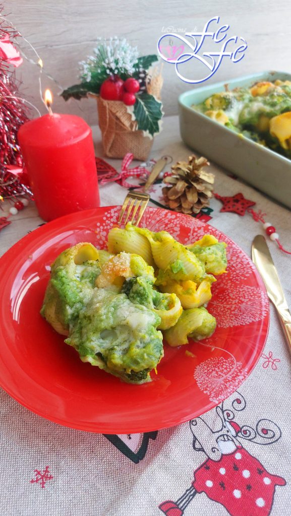 Durante as festas de Natal, todos nós temos o orgulho de confiar frequentemente em pratos mais elaborados, variando muito também nossos hábitos alimentares para celebrar da melhor forma a união familiar, especialmente à mesa! Graças às nossas tradições culinárias de norte a sul, podemos sempre saborear tanto pratos típicos quanto receitas mais criativas. O denominador comum é sempre o mesmo, decorar a mesa para a festa e compartilhar com os entes queridos algo que possa surpreendê-los e conquistá-los à primeira mordida! Estes lumaconi são certamente um primeiro prato espetacular para se propor não só no Natal, mas também em outras importantes ocasiões, porque é particularmente suculento e saboroso, mas ao mesmo tempo mais leve e saudável. É feito, de fato, com um tipo de massa muito particular, que se presta a ser recheada de mil maneiras, por isso aqui a possibilidade de livres reinterpretações nas combinações e nos acompanhamentos a propor podem realmente ir muito além das mais clássicas e tradicionais! Eu escolhi a abóbora como ingrediente principal em combinação com os brócolis, reduzidos a creme, em substituição ao molho branco. Um prato rico em sabores, tornado ainda mais saboroso pelas anchovas em óleo adicionadas ao recheio junto com o asiago. Para quem ama surpreender à mesa, mas com um olhar sempre atento à saúde, este é um prato que recomendo vivamente! Boas festas!