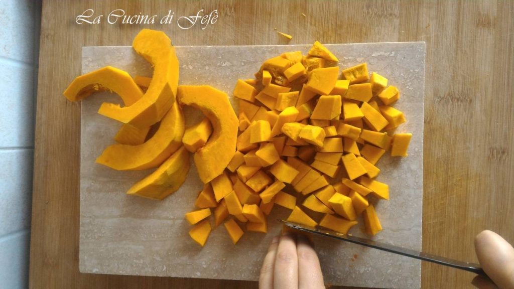 Comece limpando a abóbora, retirando a casca externa e, com a ajuda de um boleador, também as sementes internas e os filamentos.