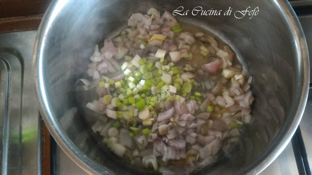 Em uma panela grande, prepare uma mistura de cebola e cebolinha fresca com 2 colheres de sopa de azeite e deixe dourar por alguns minutos em fogo alto.