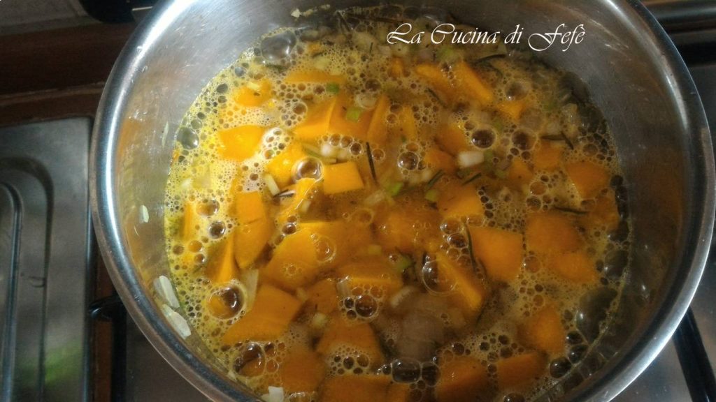 Adicione os cubos de abóbora e deixe refogar por mais um minuto.