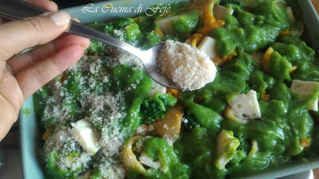 Cubra com uma generosa camada de creme de brócolis e polvilhe com bastante parmesão ralado.
