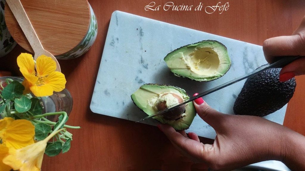 • Enquanto isso, lave o abacate em água corrente, corte-o ao meio e, com a ajuda de uma faca, retire o caroço.
