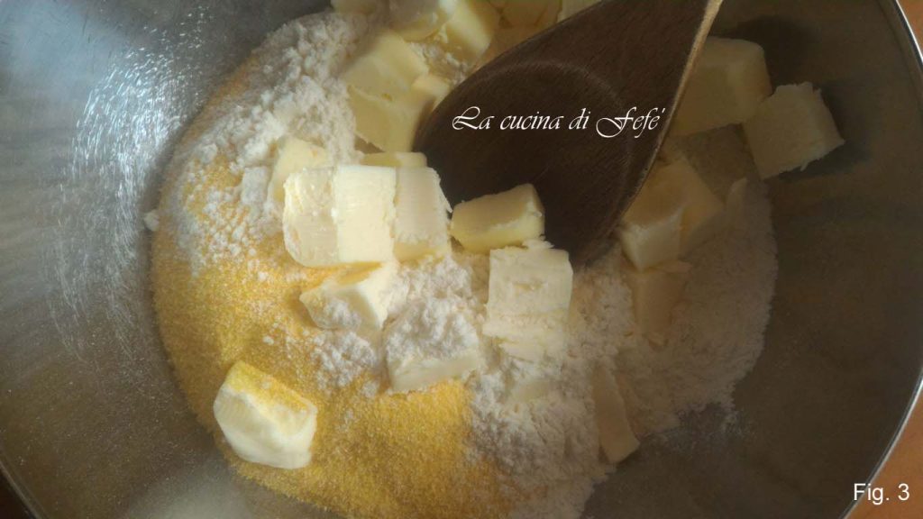 Na batedeira, ou em uma tigela grande, misture as duas farinhas com a manteiga fria em pedaços, recém-retirada da geladeira (fig. 3).