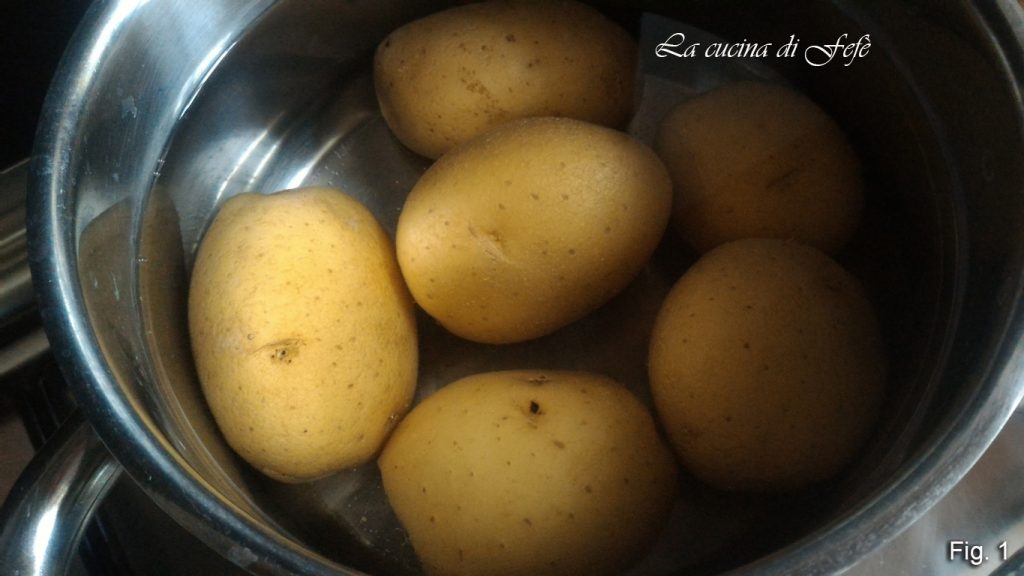 Coloque as batatas em uma panela, cubra com água fria levemente salgada, leve para ferver e cozinhe por cerca de 20′ (fig. 1).