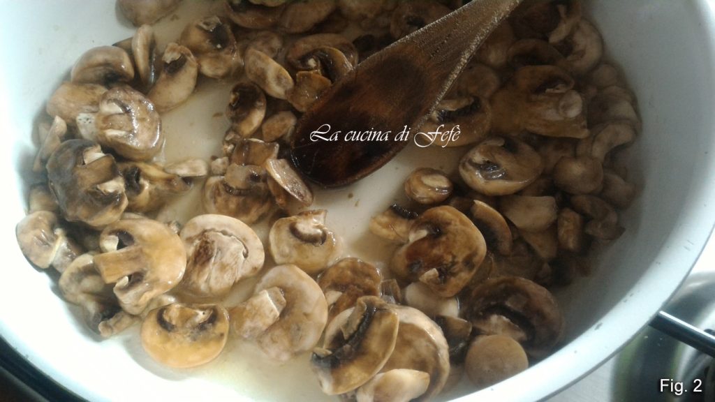 Enquanto isso, em uma frigideira antiaderente, doure o alho com um fio de azeite por 1′, em seguida adicione os cogumelos champignon limpos e fatiados (fig. 2). Tampe e deixe cozinhar em fogo não muito alto por cerca de 10′ ou até que os cogumelos estejam macios. Desligue, retire o alho, ajuste o sal e a pimenta e adicione uma quantidade generosa de salsa fresca picada (fig. 3).