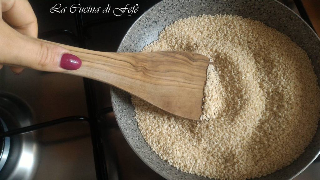 Coloque as sementes de gergelim em uma grande frigideira antiaderente e torre-as em fogo baixo por cerca de 4′-5′ mexendo continuamente com uma concha de madeira*.