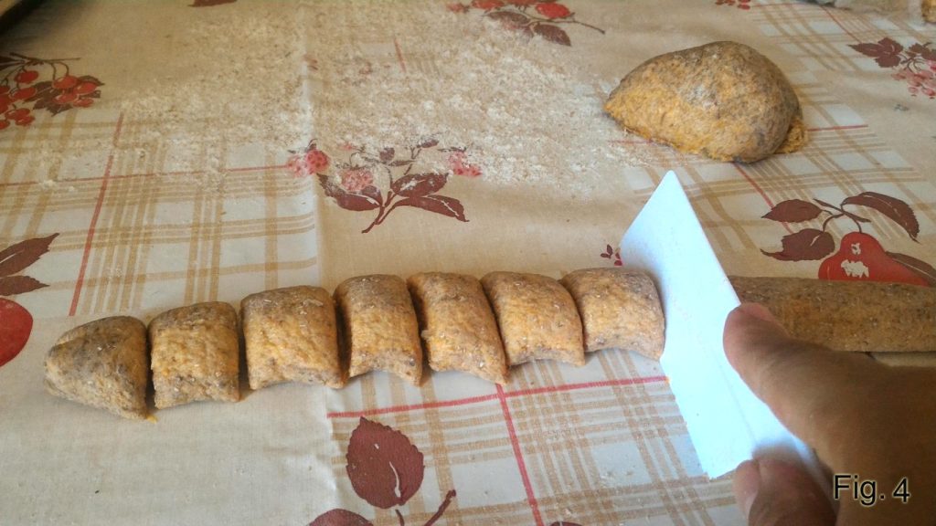 Deixe descansar em temperatura ambiente coberto por um pano de prato por pelo menos 10′. Após o tempo de descanso, pegue a massa novamente, polvilhe a superfície de trabalho com um pouco de farinha e pegue um pedaço da massa. Modele em forma de rolo e corte em pequenos pedaços de cerca de 1,5-2 cm (fig. 4).