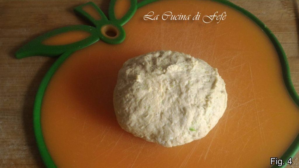 Transfira as abobrinhas para um mixer, adicione cerca de 200 gramas de farinha aos poucos com uma pitada de sal e bata várias vezes (fig. 2). Você obterá uma mistura bastante macia, então transfira para uma superfície de trabalho enfarinhada com os 30 gramas de farinha restantes e continue trabalhando a mistura (fig. 3).