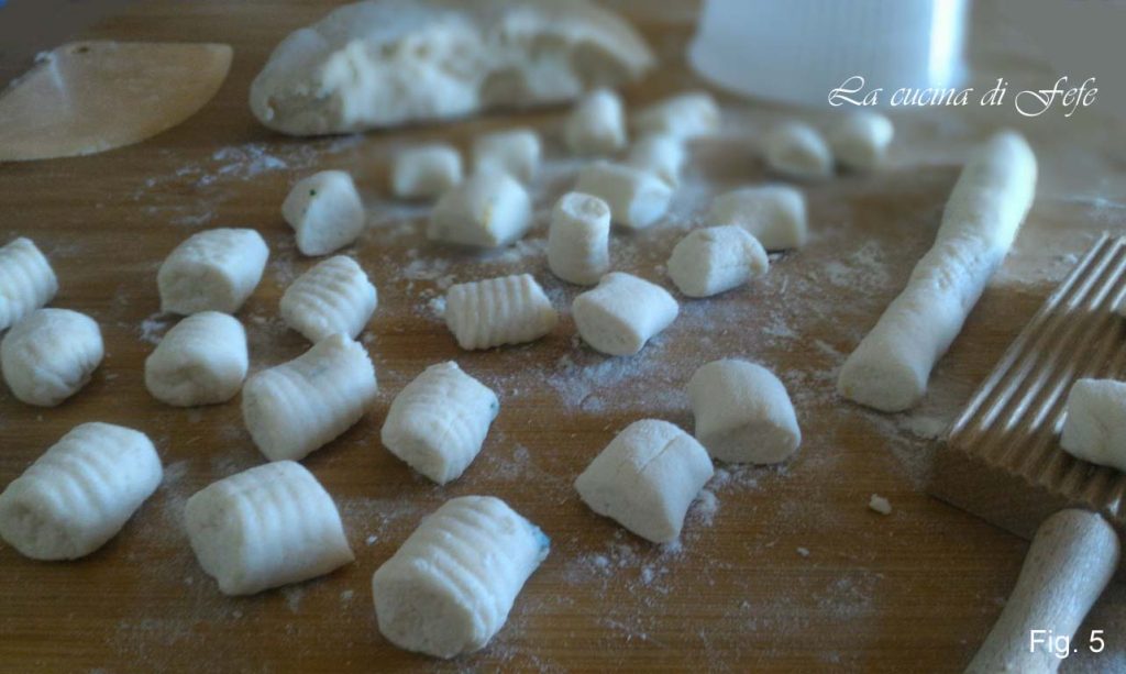 • Divida-os em pequenos pedaços regulares e passe-os no rigagnocchi, pressionando levemente com o polegar ou o indicador. Se você não tiver um rigagnocchi, use os dentes de um garfo. Arrume-os aos poucos em uma bandeja levemente enfarinhada (fig. 5).