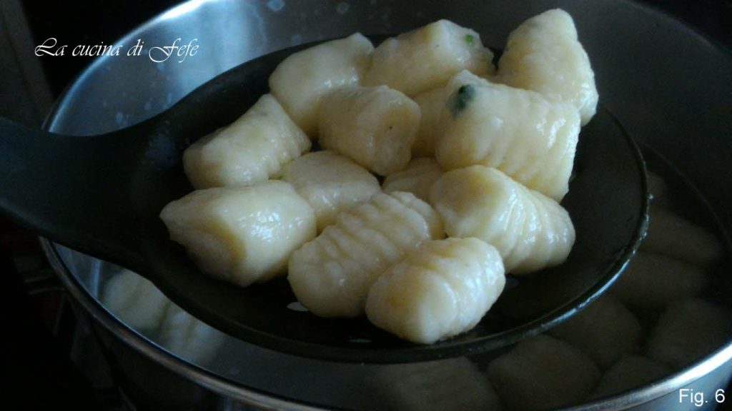 • Cozinhe o nhoque em água fervente com sal, e escorra com uma escumadeira à medida que sobem à superfície. Isso levará cerca de 2′ (fig. 6).