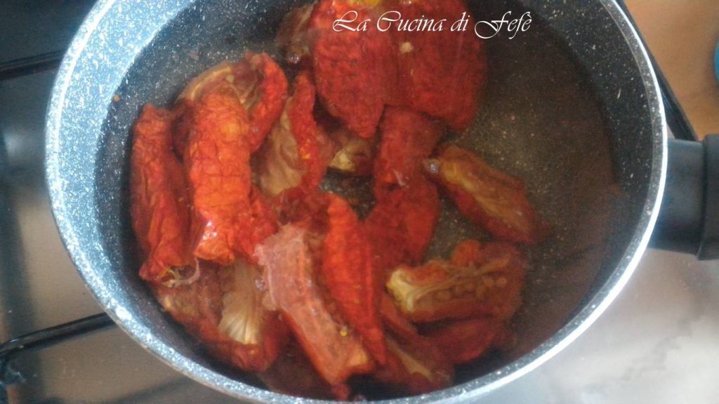 À parte, em uma panela pequena, ferva em água fervente não salgada com uma colher de vinagre de vinho branco também os tomates secos por 2′-3′.