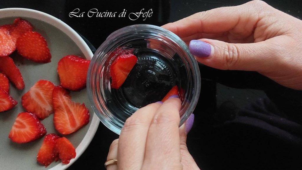 • Depois lave os morangos, seque-os, retire o talo e corte-os em fatias de cerca de 3 mm.