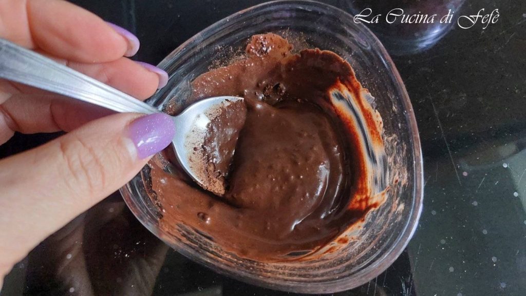 • À parte, prepare o topping de cobertura final: em uma tigela, misture o cacau amargo com o leite vegetal até obter a consistência de uma creme fluído mas suficientemente denso.