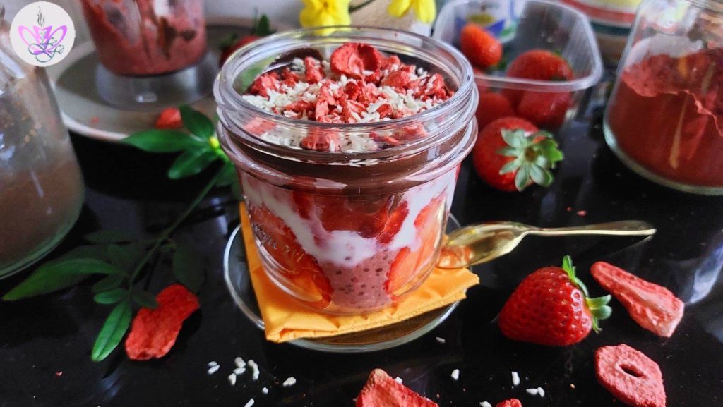 • Complete com uma pitada de morangos liofilizados quebrados grosseiramente e coco ralado, feche a tampa e coloque na geladeira definitivamente durante toda a noite*.
