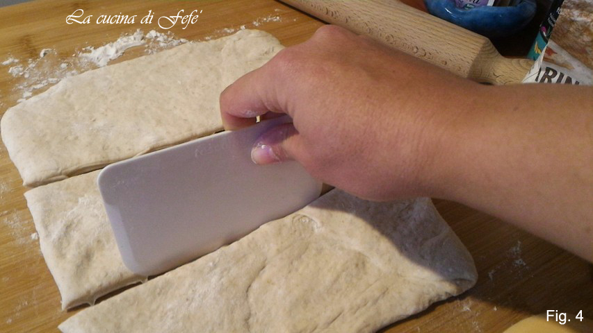 Transfira a massa para uma superfície enfarinhada e estenda primeiro com as mãos e depois um pouco com o rolo até obter um retângulo não muito fino (fig. 3).