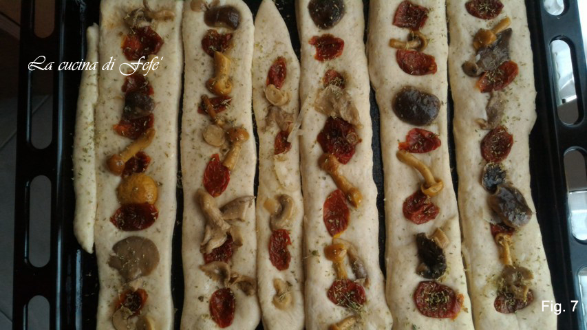 Cubra com um pano e deixe crescer por mais 2 h no forno desligado. Depois pegue novamente e recheie com os tomates secos e os cogumelos em conserva bem escorridos (fig. 7).