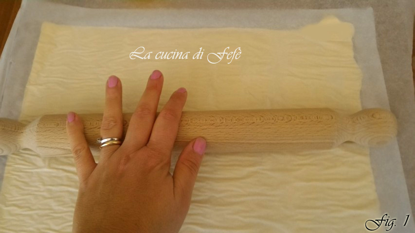 Para preparar os palitos de massa folhada aromáticos com queijo, comece desenrolando a massa folhada em uma superfície de trabalho, cubra-a com outra folha de papel manteiga e estenda levemente com o rolo (fig. 1).