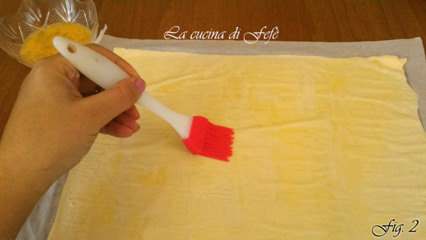 Em uma tigelinha, bata o ovo com uma pitada de sal, adicione uma colher de leite e emulsione. Distribua a mistura com um pincel de cozinha sobre a superfície da massa folhada (fig. 2).