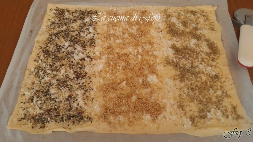 Polvilhe com o parmesão ralado sobre toda a superfície. Em seguida, divida idealmente o retângulo de massa folhada em três retângulos iguais: no primeiro distribua uniformemente uma mistura de sementes de gergelim preto e sementes de papoula, no segundo as sementes de gergelim branco e no terceiro o alecrim (fig. 3).