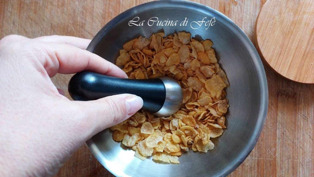 À parte, prepare o empanado: em um pilão esmague grosseiramente os corn flakes. Como alternativa, você pode colocar os corn flakes em um saco de congelamento e esmagá-los com as mãos ou com um rolo; não os reduza a pó para manter a crocância.
