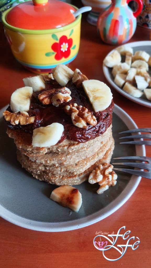 E aqui está a famosa receita das panquecas que eu já mencionei nas redes sociais! Eu já recomendei várias vezes que você varie seu café da manhã porque nunca é bom comer sempre as mesmas coisas e estas panquecas à base de banana e aveia são uma alternativa muito válida! Elas são feitas em poucos minutos, literalmente, pois tanto a preparação quanto o cozimento são realmente rápidos. O bom dessa receita é que ela é sem gorduras, ovos e açúcar, então é adequada para aqueles que querem seguir uma dieta hipocalórica ou que simplesmente querem manter a forma! Depois de prontas, você pode servi-las com o que mais gostar. Eu escolhi cobertura de chocolate, fatias de banana e algumas nozes, mas as possibilidades são inúmeras! Você pode saboreá-las a qualquer momento do seu dia, até mesmo no lanche. Eu recomendo especialmente para seus filhos, pois são muito mais saudáveis e nutritivas do que qualquer outro produto ou lanche embalado.