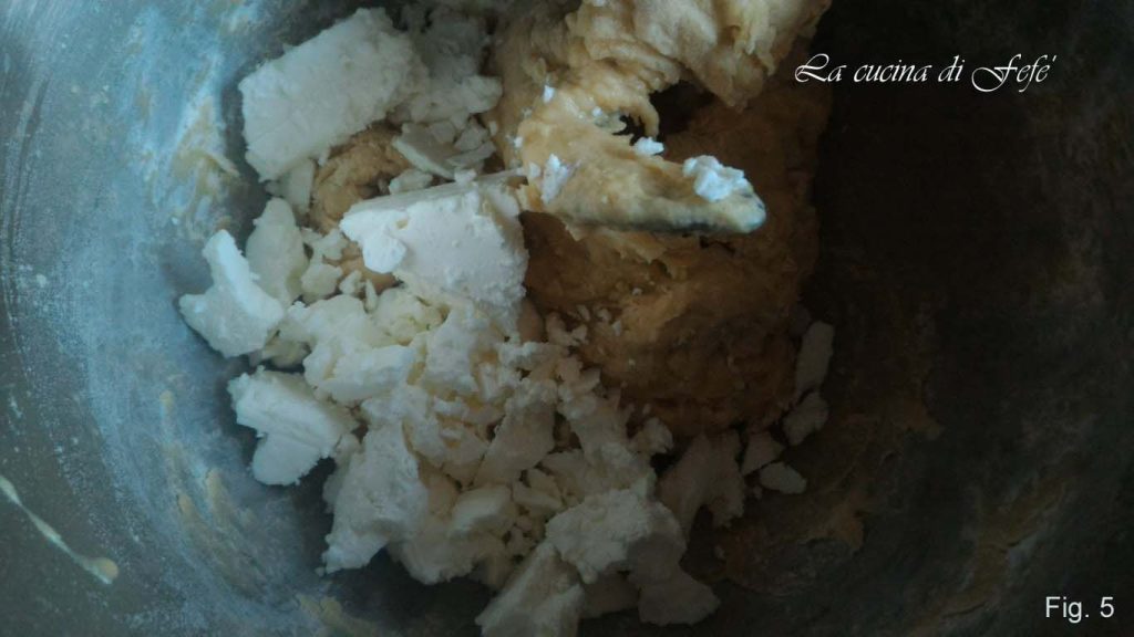 Adicione então a feta bem esfarelada. Para isso, recomendo processá-la previamente de forma grosseira antes de incorporá-la e usar um raspador gradualmente, para soltá-la das paredes da tigela (fig. 5).