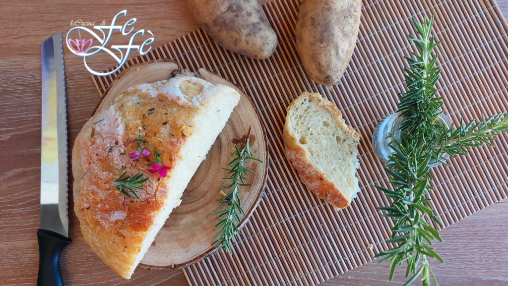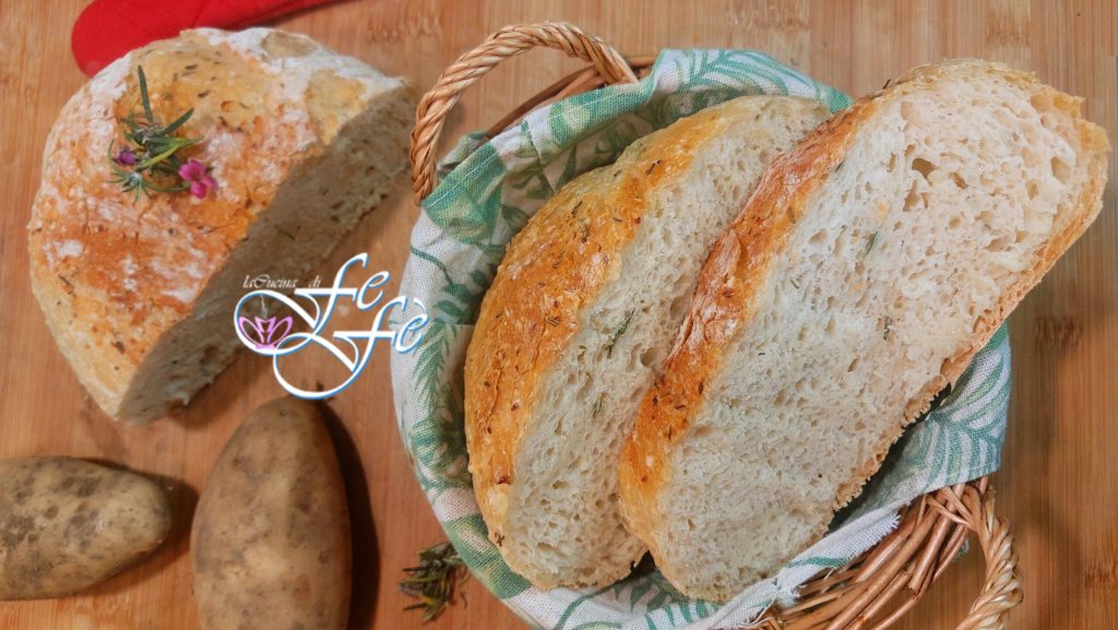 Hoje finalmente experimentei pela primeira vez minha panela de ferro fundido após quase um ano da compra! Sim, porque eu a procurava há tempos sem nunca encontrá-la, com o único desejo de assar pão dentro dela, apesar de já possuir a pedra refratária para esse propósito! E quando esse desejo finalmente se concretizou, as temperaturas excessivamente quentes dos meses seguintes me fizeram deixar a ideia de lado! Guardei a panela na embalagem original na garagem até que hoje, por conta de um clima decididamente menos opressivo, voltou a vontade de fazer pão em casa. E aqui estou eu, para contar uma receita que nos conquistou imediatamente! Um pão feito com massa de batata e muito alecrim fresco que dará uma fragrância incrível a cada fatia! O cozimento na panela conferiu uma bela crosta crocante por fora e um miolo macio por dentro. E o bom deste fermento é que requer uma massa sem amassar, parece um jogo de palavras estranho, mas significa simplesmente que não são necessários cuidados especiais para fazê-lo, apenas uma tigela grande e uma colher de pau! Uma verdadeira bênção para todos aqueles que têm pouco tempo ou paciência para pôr a mão na massa, não acham? Além disso, permanece macio até o dia seguinte, então para mim é o melhor! Experimente, porque você vai se apaixonar, será perfeito no café da manhã cortado em fatias para passar geleias, mel ou cremes pastosos no lanche. Ou até mesmo consumido puro acompanhado por embutidos.
