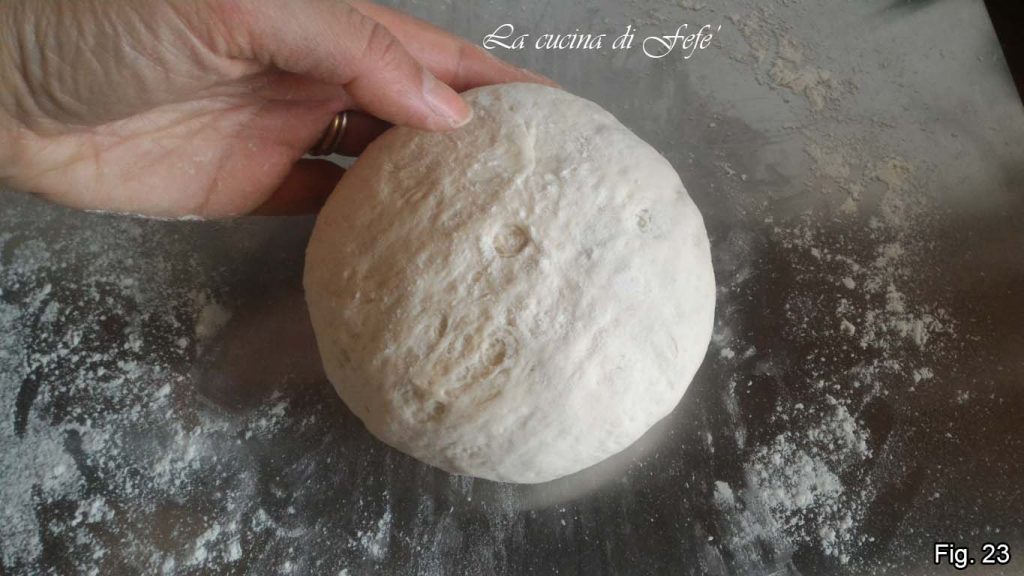 Dobre a massa sobre si mesma, depois role-a girando na superfície de trabalho, dando-lhe assim uma forma esférica. Este processo é muito importante para garantir um crescimento regular durante a fermentação (fig. 23).