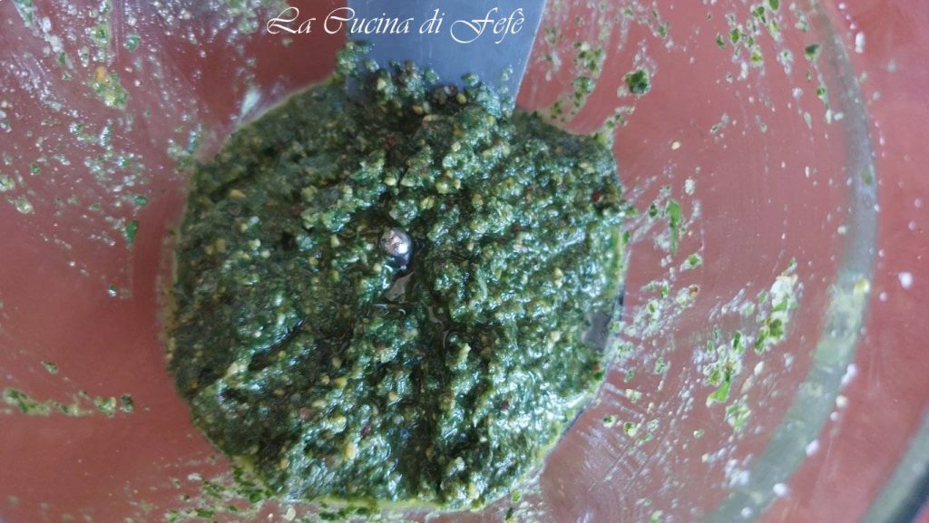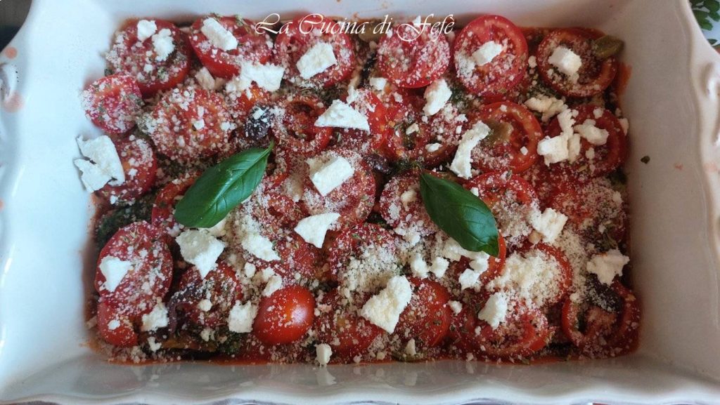 Então, mais tomatinhos, ajuste o sal e a pimenta, feta esfarelado, azeitonas, manjericão, um fio de azeite e uma pitada de parmesão. Crie uma última camada com as berinjelas restantes, o molho de tomate e o pesto, e mais parmesão ralado. Asse em forno pré-aquecido a 180°C por cerca de 25′-30′, ou até que a superfície esteja dourada.
