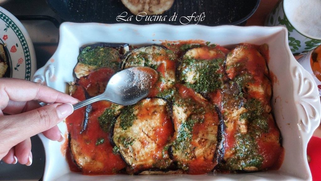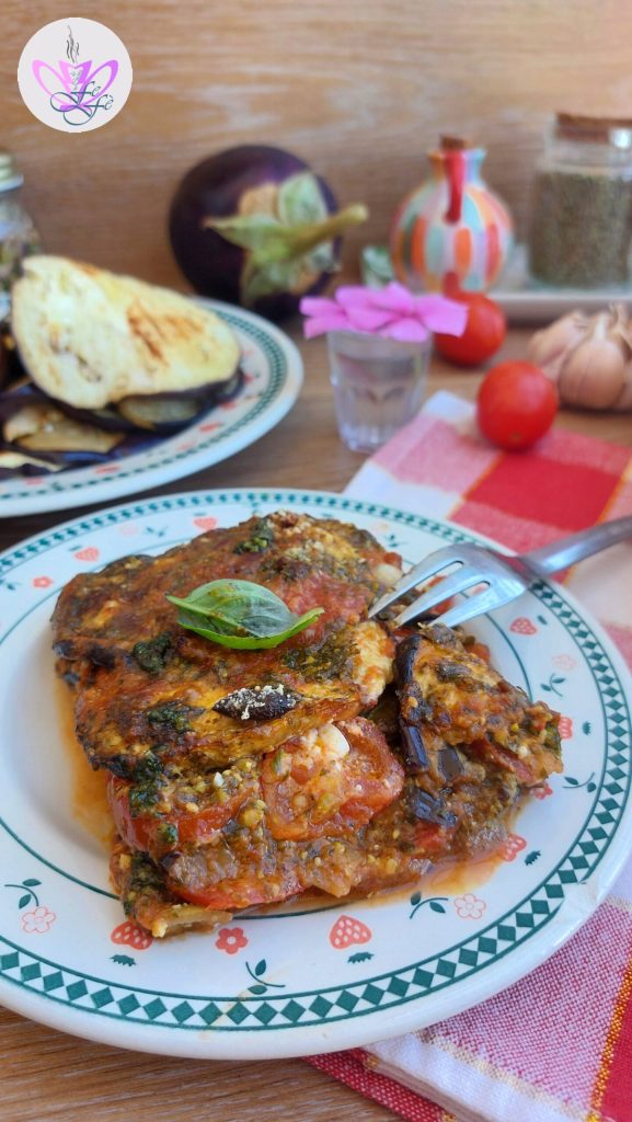 Todos conhecemos a lendária parmegiana, um prato que da Sicília foi gradualmente adotado pelo resto do país, tornando-se quase um símbolo de italianidade! Eu, no meu pequeno espaço, para saboreá-la mais frequentemente, tento prepará-la numa versão mais leve, com berinjelas grelhadas em vez de fritas! Sim, eu sei, provavelmente alterando um pouco, mas a saúde é mais importante, e garanto que a versão grelhada, além de ser menos calórica e mais digerível, é muito agradável. Mas hoje não quero fazer um tratado sobre os prós e contras da fritura, nem convencer vocês do aspecto pouco saudável que resulta disso! Prefiro contar como uma parmegiana clássica pode se tornar uma versão alternativa de qualidade, usando ingredientes de geladeira ou sobras de outras receitas! E o resultado é um prato principal vegetariano que, quando necessário, dividido em pequenos quadradinhos, pode se transformar em um aperitivo delicioso ou finger food! Se na geladeira você encontrar um pouco de feta para consumir e tiver pesto para vencer ou, como eu, das próprias reservas caseiras, esta receita é para você! Várias camadas de pura bondade, entre tomates frescos e berinjelas, temperados simplesmente unindo molho de tomate cereja a pesto de manjericão e substituindo a mussarela por feta grosseiramente esfarelada! Vai se tornar seu trunfo porque, uma vez provado, você não vai querer parar de fazer!