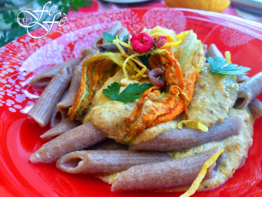 Com esta nova receita, redescubro novos sabores que desejo compartilhar com vocês, até porque seu sucesso à mesa está certamente ligado aos maravilhosos produtos da Fazenda Ciuri da qual já falei várias vezes! Esta Fazenda, pertencente à família Rabuazzo há várias gerações, está situada no território de Belpasso, no meio da Planície de Catânia. O lema deles é o desenvolvimento natural de tudo o que é produzido, o que se traduz em poucas palavras em cultivos BIO, onde não são utilizados nem agentes antiparasitários químicos, nem de derivação biotecnológica. Em particular, eles propõem produtos feitos com o trigo autóctone siciliano de tumminìa que, acreditem, faz realmente a diferença! Assim, farinhas, pães, tipos de massas e outros produtos de forno tornam-se verdadeiras preciosidades a descobrir e saborear! A que proponho hoje, por exemplo, é uma massa inteiramente integral, portanto menos refinada e mais rica em substâncias nutritivas. Além disso, seu sabor rústico combina muito bem com o sabor da crema à base de flores de abobrinha e ricota, enquanto sua porosidade é tal que lhe permite absorver perfeitamente todo o molho. Para completar esta combinação já perfeita, adicionei algumas anchovas em conserva, flores de abobrinha levemente escaldadas, salsinha e abundantes raspas de cidra ao servir. O que dizer? Uma delícia! Enfim, com uma massa assim, não poderia deixar de exaltar seu valor e qualidade senão com ingredientes igualmente especiais! Agradeço mais uma vez a Roberta Rabuazzo por estes produtos realmente de nicho.