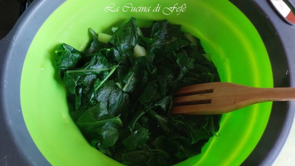 • Leve a ferver uma panela com água salgada. Primeiro coloque os cubinhos do talo e deixe cozinhar por cerca de 5 minutos. Acrescente também as folhas, que vão murchar na hora e liberar todo o aroma. Deixe cozinhar mais 2′.