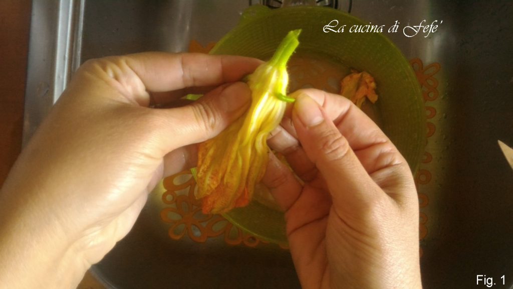 Lave sem quebrá-las as flores de abobrinha sob uma corrente suave de água, remova as excrescências que se encontram na base com uma faca ou simplesmente com as mãos. Este passo é importante para garantir que as flores estejam prontas para a preparação.