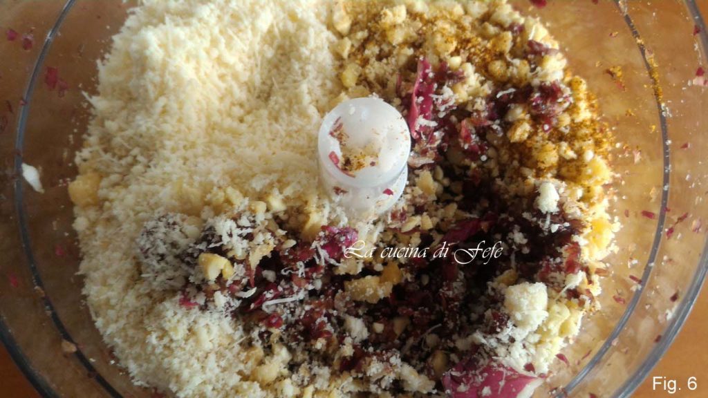 Se preferir um sabor mais suave, deixe as folhas de radicchio de molho em água fria e uma pitada de sal por 15 minutos antes de triturá-las. Também o uso das castanhas de caju e do creme serve especificamente para mitigar a ponta amarga natural do vegetal.