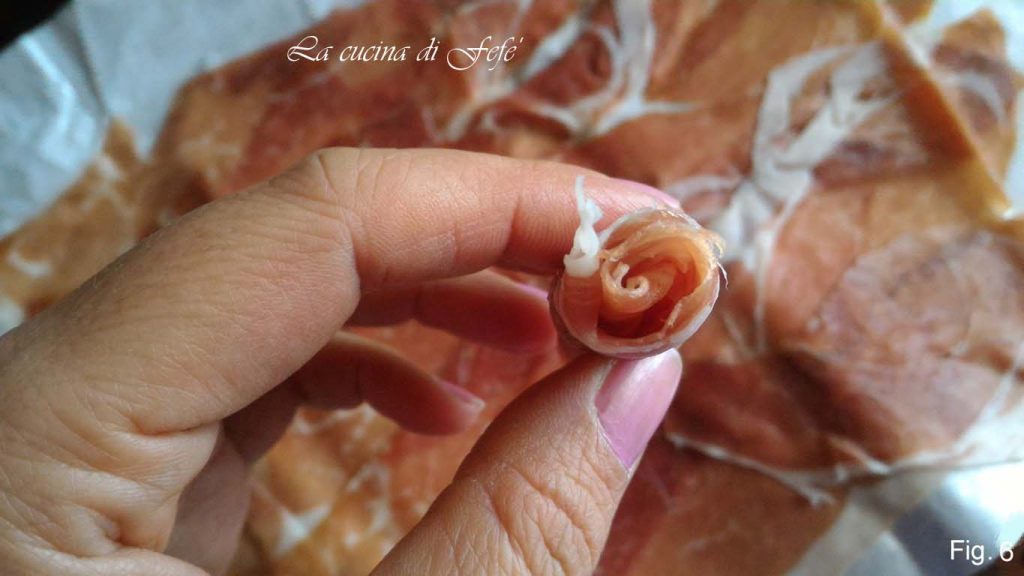• Corte o emmenthal e o speck em tiras e enrole-as (fig. 6).