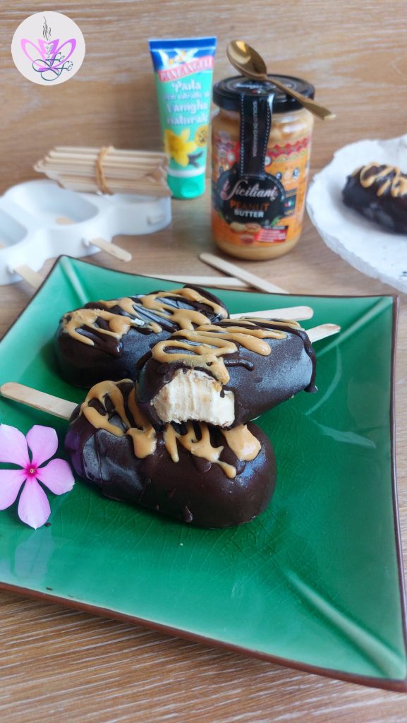 Já faz alguns anos que não compro mais picolés industrializados porque eu mesma os preparo artesanalmente em casa, com poucos ingredientes e todos de qualidade! Tenho que dizer que todos eles me deram uma grande satisfação! São simples e rápidos de preparar, naturalmente é preciso considerar o tempo de descanso no freezer. O único defeito? Acabam rápido! Estes de manteiga de amendoim são super saborosos, com um recheio rico e cremoso à base de queijo fresco cremoso e uma cobertura deliciosa e crocante de chocolate amargo. Uma excelente estratégia que permite obter uma mistura espessa e cremosa semelhante ao creme de leite, mas sem usá-lo. Uma bela esperteza para evitar o inconveniente de adicionar muitas gorduras saturadas à sua preparação e o tão prejudicial leite condensado! Na verdade, a maioria das versões industrializadas contém quantidades elevadas de açúcar, conservantes e outros aditivos que alteram o perfil nutricional. Nos meus picolés, você encontrará apenas alguns gramas de adoçante para um lanche saudável sem picos glicêmicos! Com estas doses, você obterá 4 picolés médios-grandes, mas se não usar o mesmo molde que eu, pode sobrar massa para mais dois picolés! Experimente porque são espetaculares!
