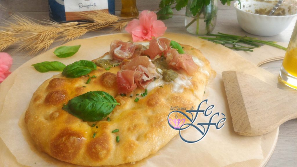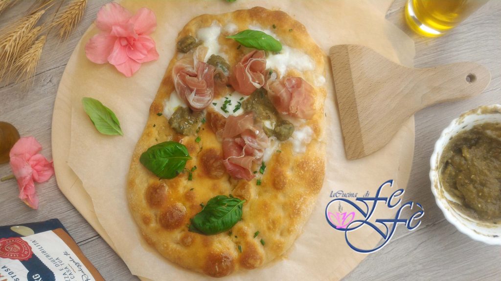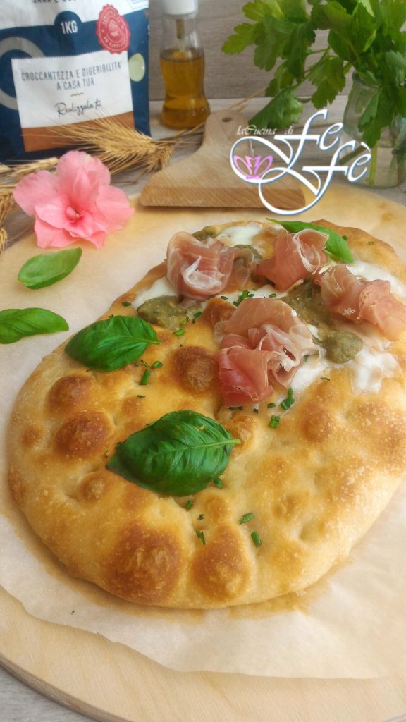 Eu temperei com mozzarella fior di latte, pesto de vagens de favas, rosetas de presunto cru, azeite, manjericão e cebolinha fresca.