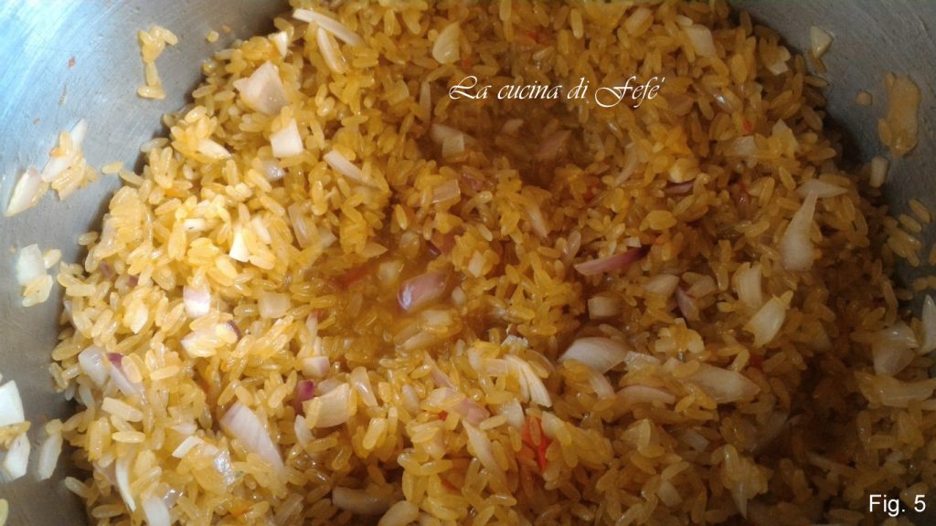 Pique a echalote e refogue-a suavemente em uma panela grande com duas colheres de azeite. Em seguida, adicione o arroz e toste-o por alguns minutos.