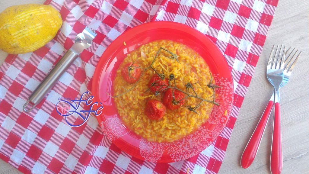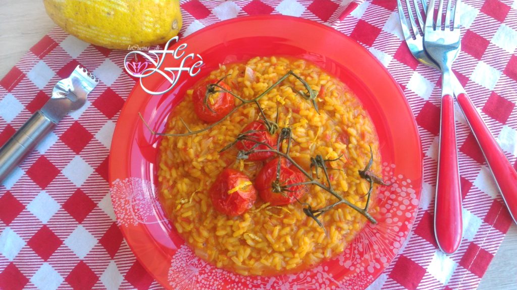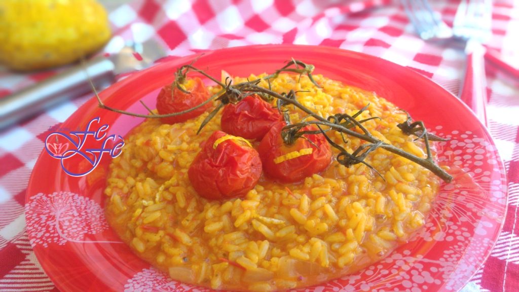 Antes de abandonar definitivamente os produtos hortifrutícolas da estação do verão, me permiti um último prato à base de tomatinhos cereja, um presente querido de uma amiga, que os trouxe de Pachino! E eu poderia não fazer justiça a eles? Claro que não! E aqui está um risoto doce e perfumadíssimo, onde o tempero é ainda mais saboroso graças ao cozimento dos tomatinhos assados no forno, com aquele toque de especiarias dado pela cúrcuma e finalmente realçado por raspas de cedro, também este um outro presente útil! A receita é realmente muito simples, mas traz consigo todo o sabor do verão que acabamos de deixar para trás, e da minha amada terra. Eu, que sempre amei os contrastes, vocês já me conhecem, quis combinar poucos ingredientes de qualidade para um resultado nada banal! Este prato principal, genuíno e de grande impacto, será apreciado por toda a família e se tornará sua carta na manga! Tenho certeza que você vai se apaixonar por ele como eu!